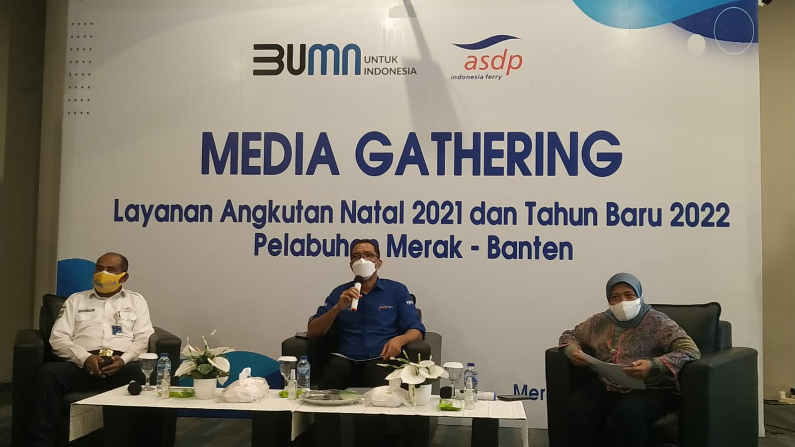 Direktur Komersial dan Pelayanan PT ASDP, Yusuf Hadi, Senior General ManAjer Regional 2 ASDP, Lin Astuti dan GM ASDP Merak, Hassan Lessy saat Kegiatan Media Gathering Layanan Angkutan Natal 2021 dan Tahun Baru 2022 di Dermaga 6 Eksekutif, Pelabuhan Merak, Kota Cilegon, Kamis (23/12/2021). Foto Ronald/Selatsunda.com