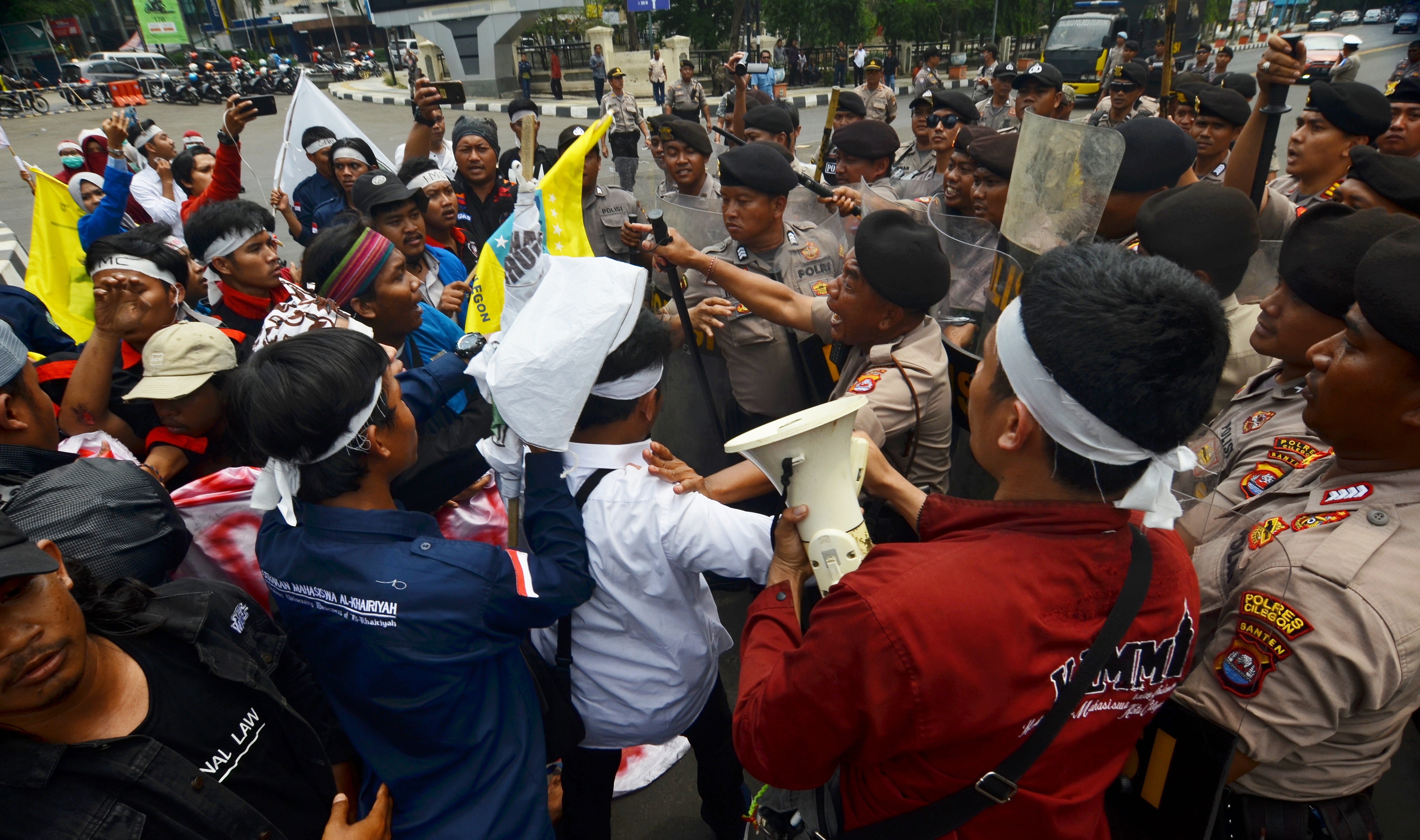 Aksi kemudian kembali berujung dorong-dorongan. Antara mahasiswa dan aparat sempat terlihat saling adu mulut. Saat itu, salah seorang mahasiswa terjatuh dan masuk kedalam selokan yang ada di Landmark. Aksi sempat memanas namun kemudian dapat dikendalikan aparat.