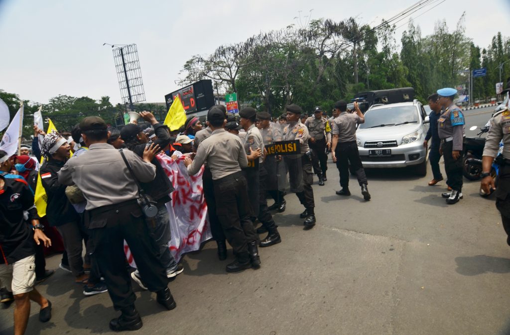 Pantauan Selatsunda.com, sebelumnya aksi diwarnai dorong-dorongan antara mahasiswa dan polisi sekitar pukul 11.00 WIB. Mahasiswa tampak kembali berorasi dan mendapat penjagaan ketat aparat. Tidak lama, mahasiswa berusaha untuk menghadang mobil yang keluar dari lokasi pelantikan. Polisi yang melihat itu langsung berusaha menghentikan aksi tersebut.