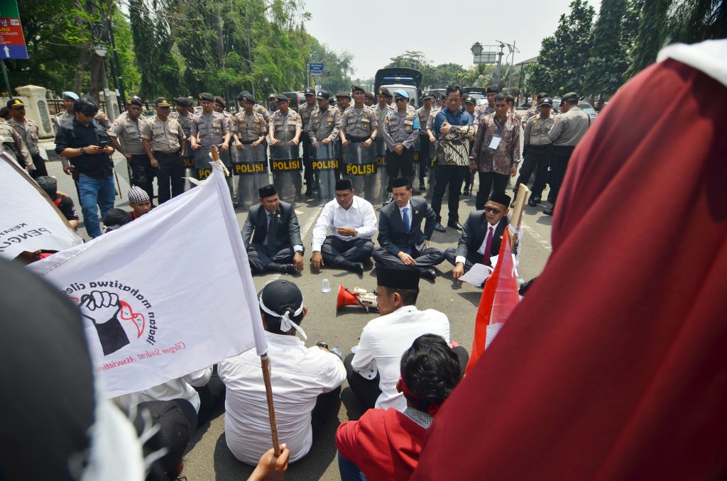 “Kita tenangkan. Kita pertegas lagi, musuh kita bukan kepolisian, musuh kita bukan aparat. Musuh kita adalah wakil rakyat yang dzolim, wakil rakyat yang tidak menemui rakyatnya,” ujar Ketua Umum Ikatan Mahasiswa Cilegon,