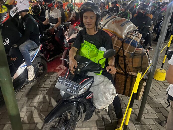 CILEGON, SSC – Edi Mustofa (25) warga Kabupaten Pandeglang, Banten harus rela sempit-sempitan dengan barang bawaanya diatas motor untuk pulan ke kampung halamannya ke Lampung demi menemui keluarganya.