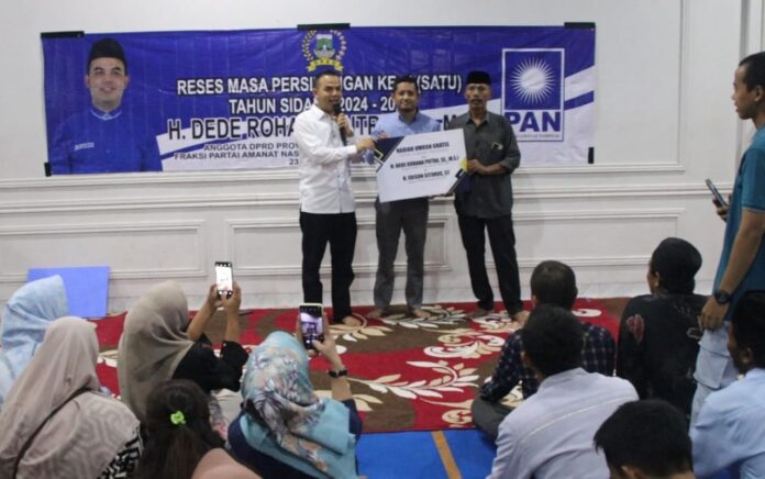 CILEGON, SSC – Anggota Dewan Perwakilan Rakyat Daerah (DPRD) Provinsi Fraksi Partai Amanat Nasional (PAN), Dede Rohana Putra melakukan Reses Masa Persidangan ke 1 Tahun Sidang 2024-2025 di Kalitimbang, Kecamatan Cibeber, Kota Cilegon, Kamis (24/10/2024) malam. Di tengah kegiatan reses perdana itu, Dede Rohana memberikan hadiah umrah kepada belasan tim suksesnya yang membantu dirinya dan anggota DRR RI dari Fraksi PAN, Edison Sitorus pada pemenangan di Pileg 2024 lalu.