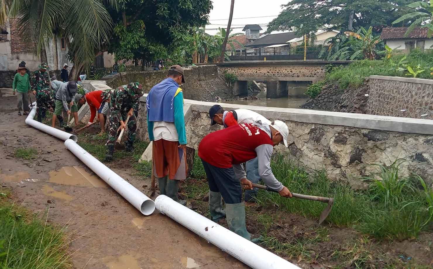 Prajurit TNI bersama kelompok tani dan masyarakat membangun pipanisasi untuk mengairi persawahan di Kelurahan Panggung Rawi, Kecamatan Jombang, Kota Cilegon, Minggu (26/4/2026). Foto Ist