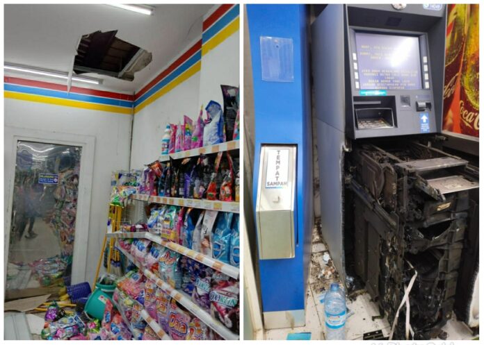“Pertama kali kejadian ini diketahui oleh karyawan minimarket melihat kondis sudah acak-acakan, plafon dan genteng sudah jebol. Kemudian, sanksi ini pun langsung melihat kondisi mesin ATM sudah rusak parah,” ujarnya.