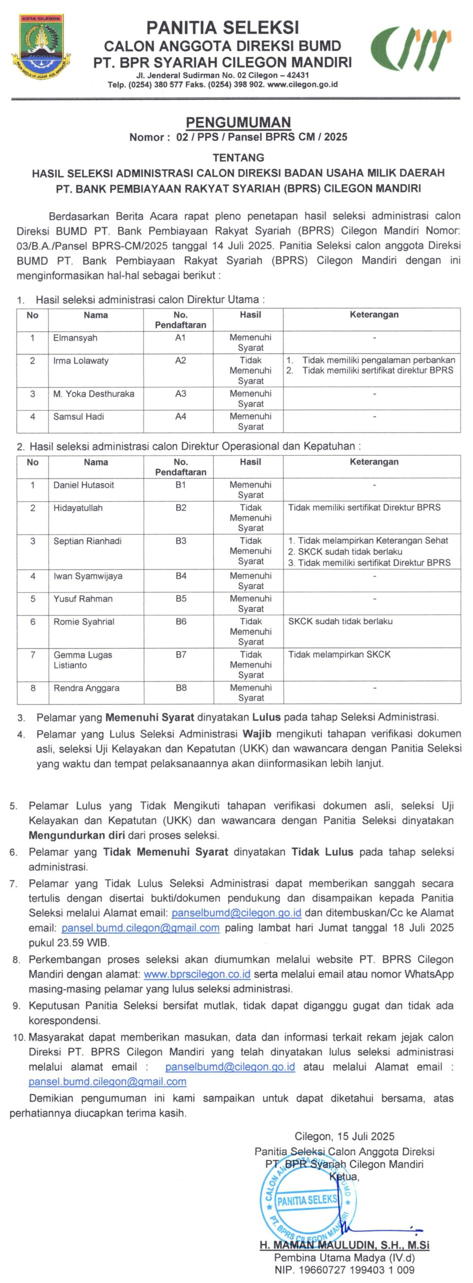 Informasi ini disampaikan dalam Pengumuman Nomor: 02/PPS/Pansel BPRS CM/2025. Hasil seleksi administrasi ditetapkan berdasarkan Berita Acara rapat pleno penetapan hasil seleksi administrasi calon Direksi BUMD PT. Bank Pembiayaan Rakyat Syariah (BPRS) Cilegon Mandiri Nomor: 03/B.A.JPansel BPRS-CM/2025 tanggal 14 Juli 2025.