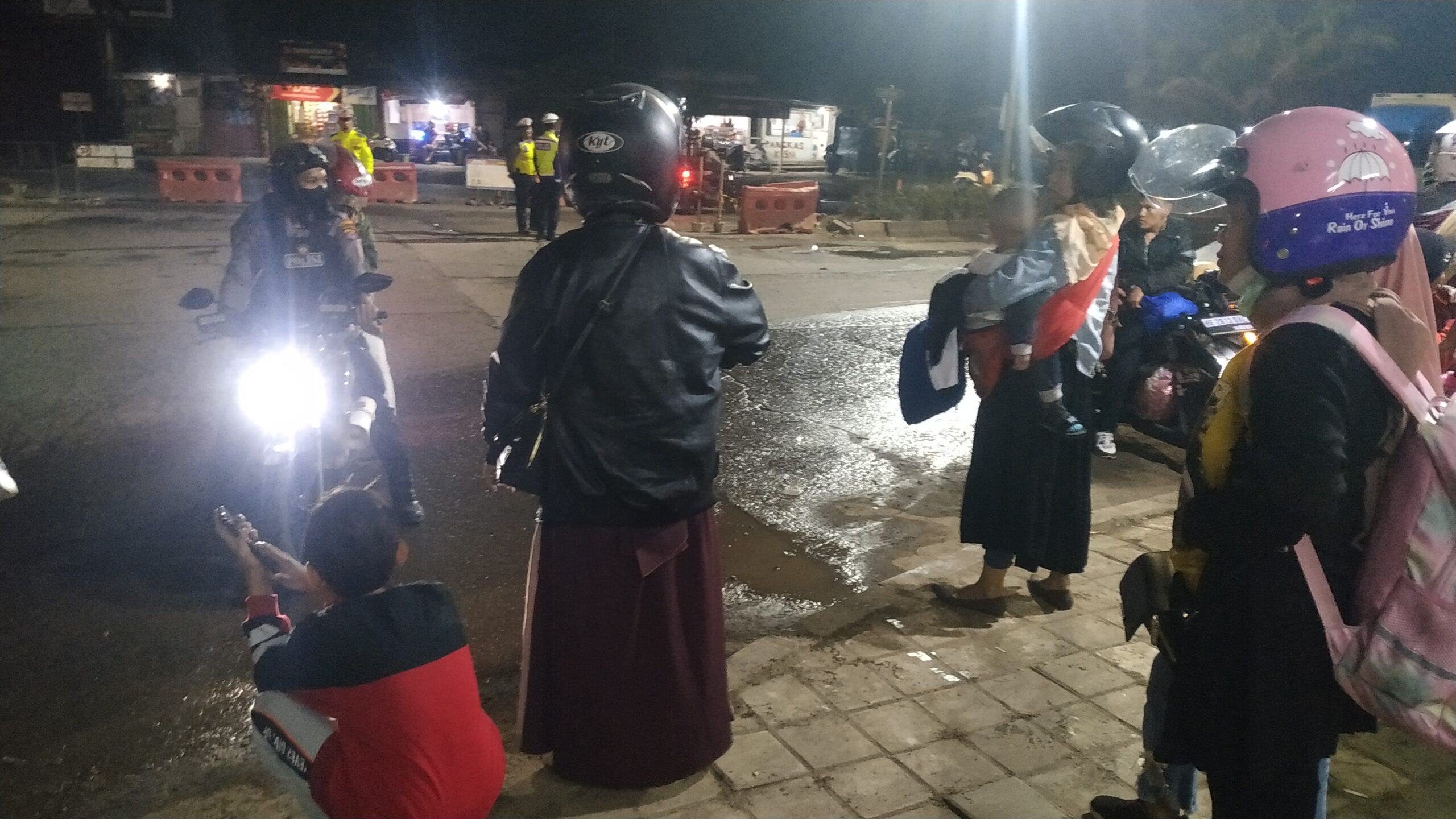Tampak pemudik yang dievakuasi ke pos Polisi terlihat beristirahat sejenak. Ada pula mereka duduk di trotoar menunggu suami agar kendaraan yang digunakan tidak terlewat.