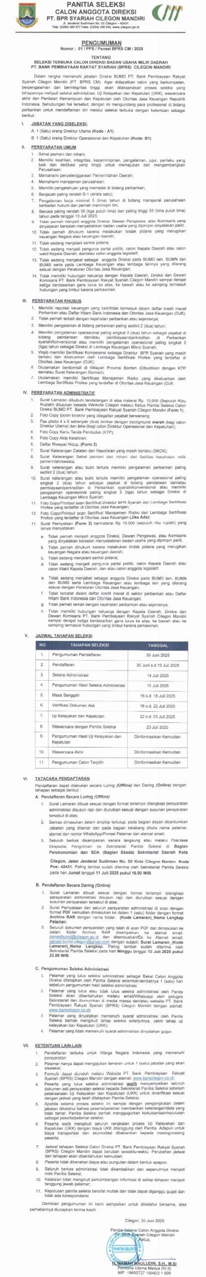 Berikut dilampirkan lengkap Pengumuman seleksi terbuka calon direksi badan usaha milik daerah PT BPRS CM, atau bisa klik disini