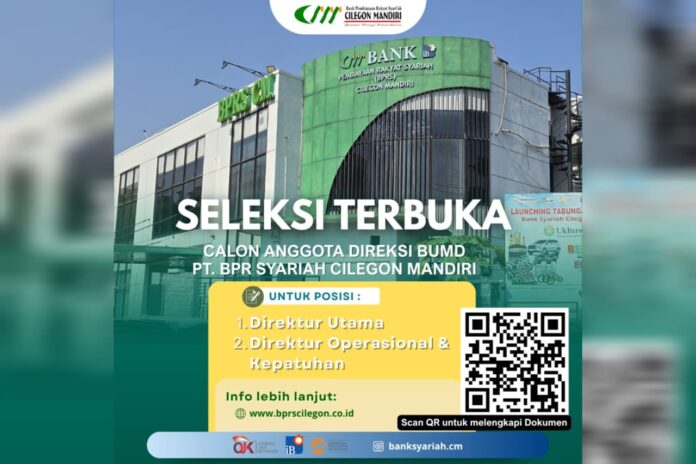 CILEGON, SSC – Dalam rangka memenuhi jabatan Direksi BUMD PT. Bank Pembiayaan Rakyat Syariah Cilegon Mandiri (PT. BPRS CM). Agar didapatkan calon yang berkompeten, berpengalaman dan berintegritas tinggi. Panitia Seleksi (Pansel) Calon Anggota Direksi PT BPRS CM mengumumkan seleksi terbuka calon direksi badan usaha milik daerah PT BPRS CM.
