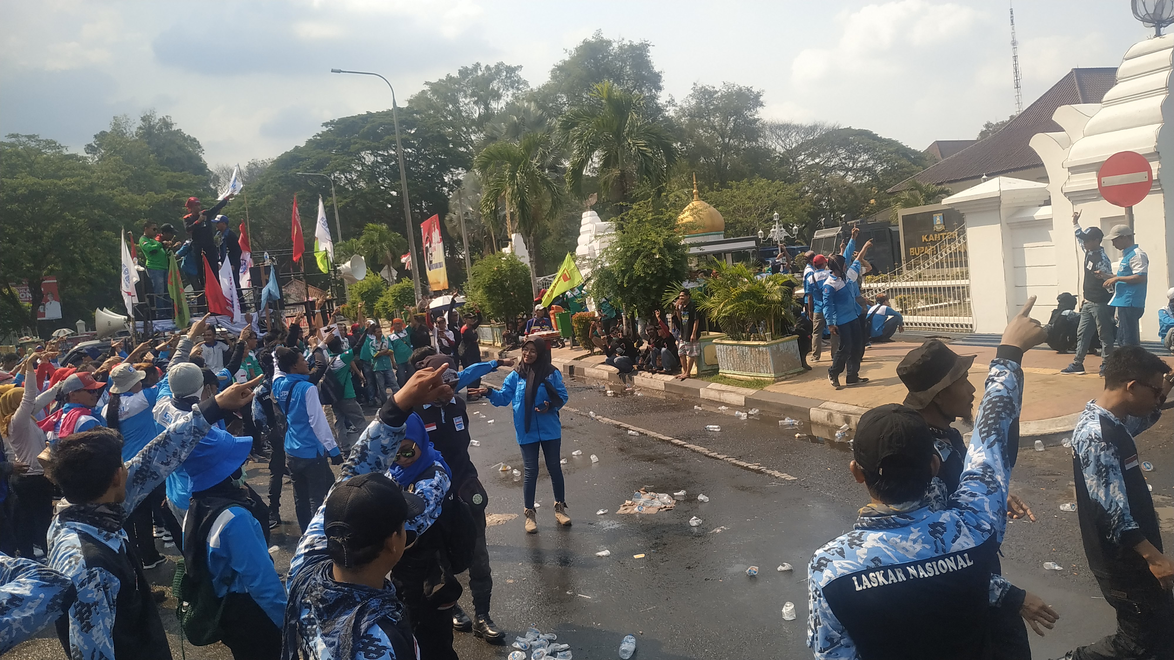 SERANG, SSC – Ratusan buruh yang tergabung dalam Aliansi Serikat Pekerja Serikat Buruh (ASPSB) Kabupaten Serang melakukan aksi unjuk rasa di depan Kantor Pemerintahan Kabupaten Serang, Rabu (20/11/2019). Para pendemo menyerukan sejumlah tututan. Selain menolak upah murah dan menuntut UMSK 20 naik hingga 6 persen, buruh juga menolak kenaikan iuran BPJS.