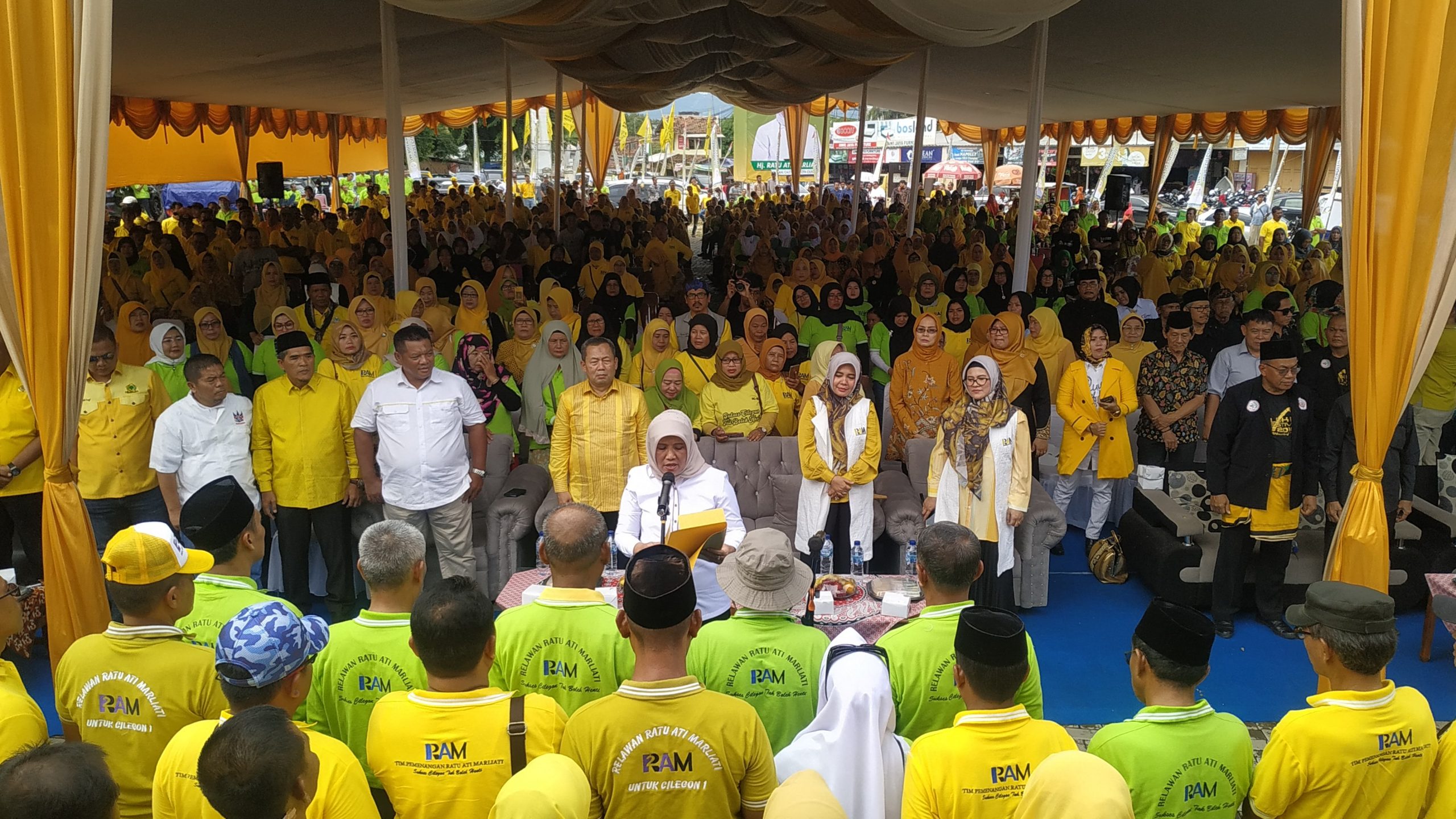 Ati datang dengan menggenakan baju lengan panjang berwarna putih didampingi suami, anak dan keluarga besar. Bacalon sekaligus Wakil Walikota Cilegon ini datang dan langsung menyapa para pendukung, pengurus, kader dan simpatisan Partai Golkar, Paguron se-Kecamatan Jombang yang sudah menunggunya.