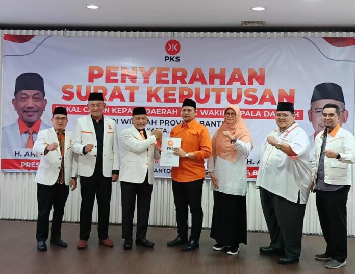 CILEGON, SSC – Partai Keadilan Sejahtera (PKS) resmi memberikan Surat Keputusan (SK) Bakal Calon Walikota dan Wakil Walikota Cilegon kepada Isro Mi’raj dan Nurrotul Uyun untuk maju pada Pilkada Kota Cilegon 2024. SK kepada Isro dan Uyun diserahkan langsung oleh Presiden PKS, Ahmad Syaikhu di Kantor DPP PKS, Jakarta, Senin (15/7/2024).