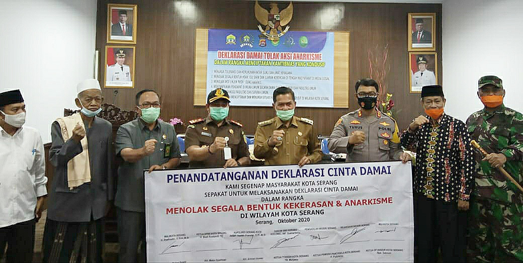 SERANG, SSC – Musyawarah Pimpinan Daerah (Muspida) Kota Serang bersama tokoh agama dan tokoh masyarakat menolak aksi anarkisme di Kota Serang dengan melakukan deklarasi damai. Hal ini bertujuan untuk menjaga kondusifitas di daerah Kota Serang.