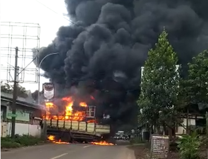 SERANG, SSC – Truk Tronton terbakar hebat diduga muatan styrofoam yang diangkut terkena kabel listrik saat di Jalan Raya Serang Pandeglang, Kelurahan Kemanisan, Kecamatan Curug, Kota Serang, Selasa (8/3/2022).